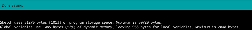 Sketch uses 32142 bytes (104%) of program storage space. Maximum is 30720 bytes Global variables use 1348 bytes (65%) of dynamic memory, leaving 700 bytes for local variables. Maximum is 2048 bytes.